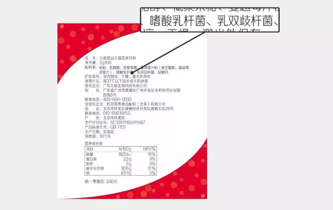 九極愛益生菌產(chǎn)品配料表上明確標(biāo)示著菌種菌株: