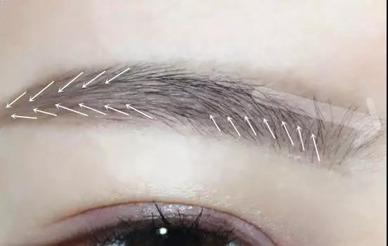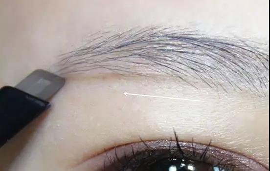 開(kāi)始填色,按箭頭方向填填眉尾,眉頭靠下的部分也可以按著毛流填一下。